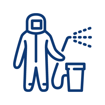 Nossos técnicos se deslocam até o local devidamente equipados. Aplicam o produto com pulverizadores ou nebulizadores em superfícies da estrutura: paredes, pisos, tetos, portas e divisórias.